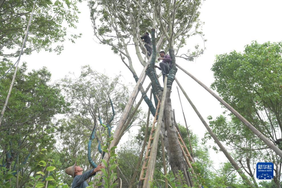 7月27日,漳浦縣長(cháng)橋鎮友愛(ài)村旺山園林有限公司工人在加固大型苗木。