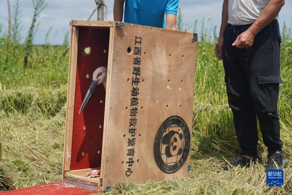 在江西省進(jìn)賢縣鐘陵鄉,一只由江西省野生動(dòng)物救護中心救治康復后的東方白鸛緩緩走出木箱,準備回歸大自然(7月20日攝)。