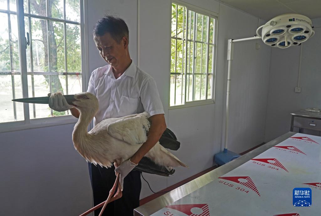 在位于江西省永修縣的江西鄱陽(yáng)湖國家級自然保護區吳城保護站,王小龍將一只東方白鸛抱出體檢室(7月15日攝)。