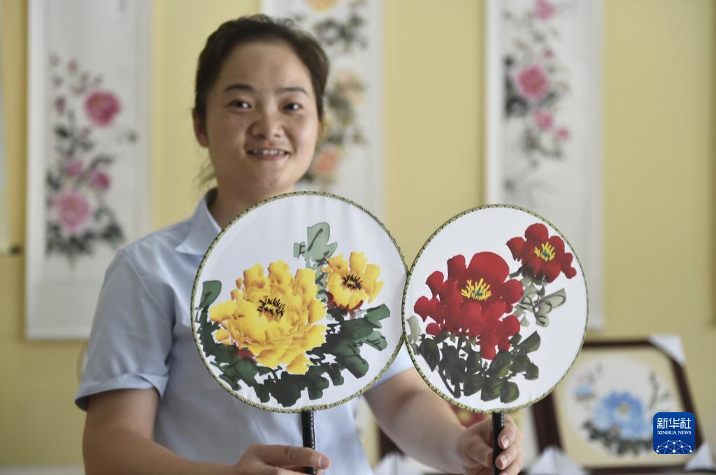 7月26日,工作人員在平樂(lè )社區的牡丹畫(huà)創(chuàng )意產(chǎn)業(yè)園區展廳內展示牡丹畫(huà)團扇。