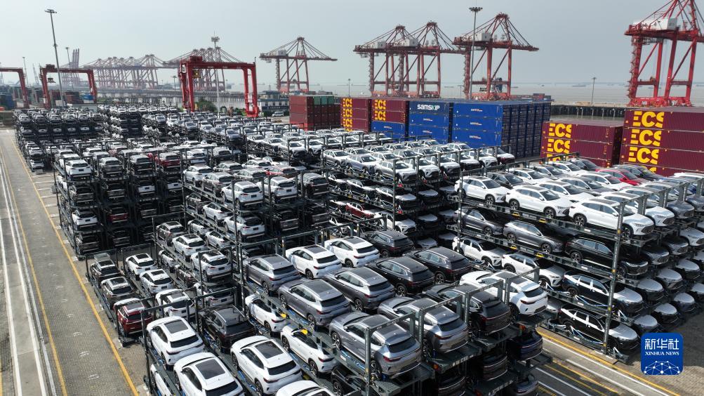 2023年7月11日,在江蘇省太倉港國際集裝箱碼頭,一批新能源汽車(chē)即將通過(guò)專(zhuān)用框架運輸方式出口(無(wú)人機全景照片)。