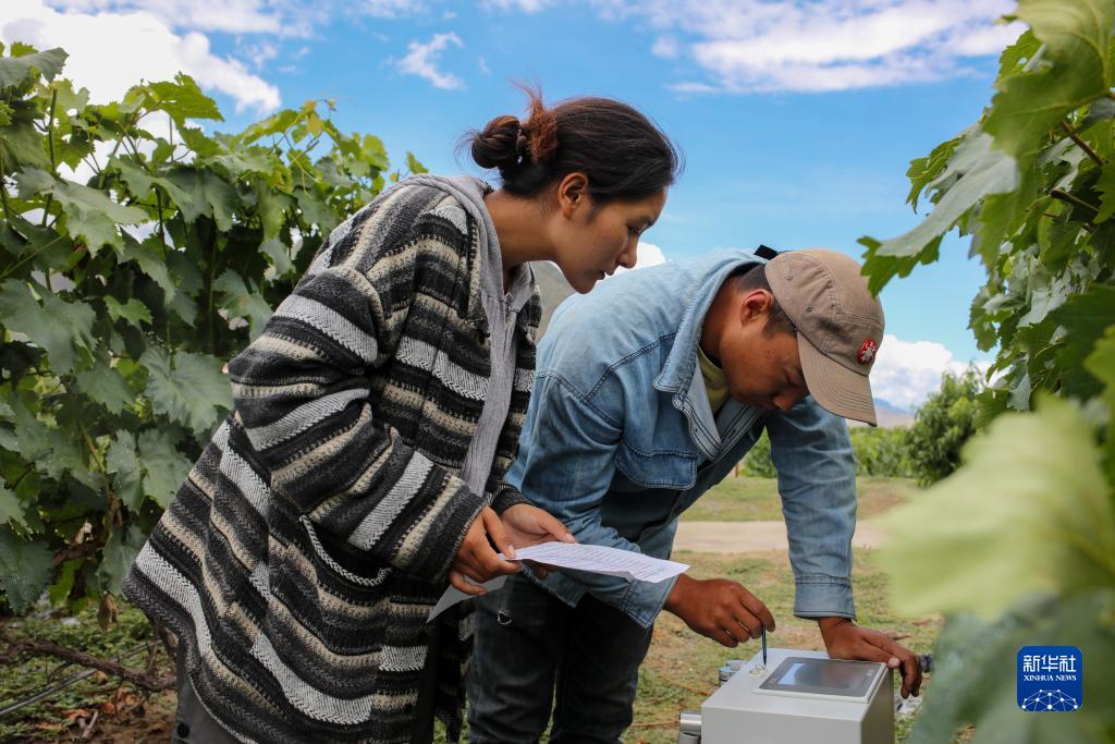 7月26日,桑日縣一家葡萄酒企業(yè)的員工曲珍(左)在葡萄園里向技術(shù)員何志榮學(xué)習操作光譜儀。