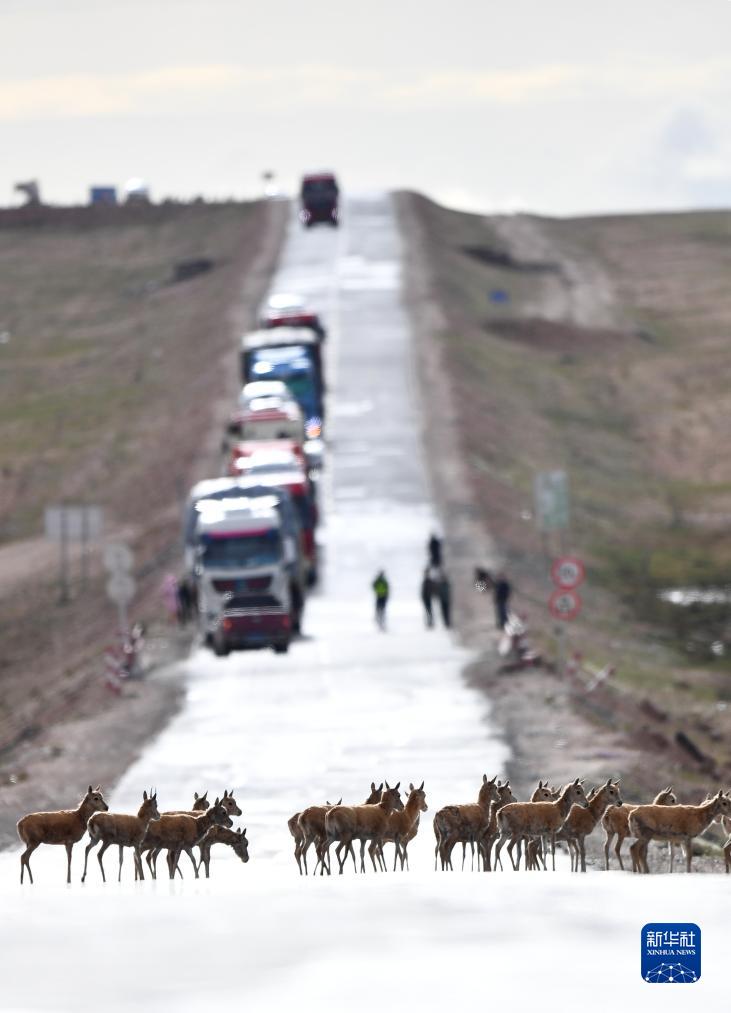 7月28日,一群藏羚羊通過(guò)青藏公路前往三江源地區的棲息地。