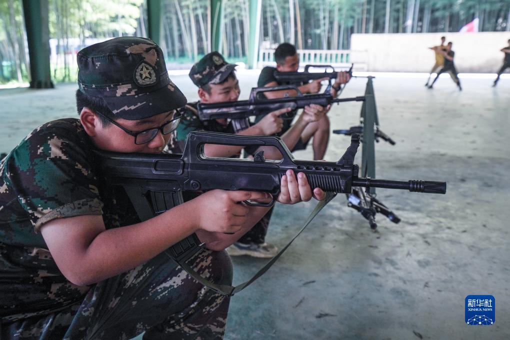 7月27日,參加軍事夏令營(yíng)的小朋友在練習瞄準。