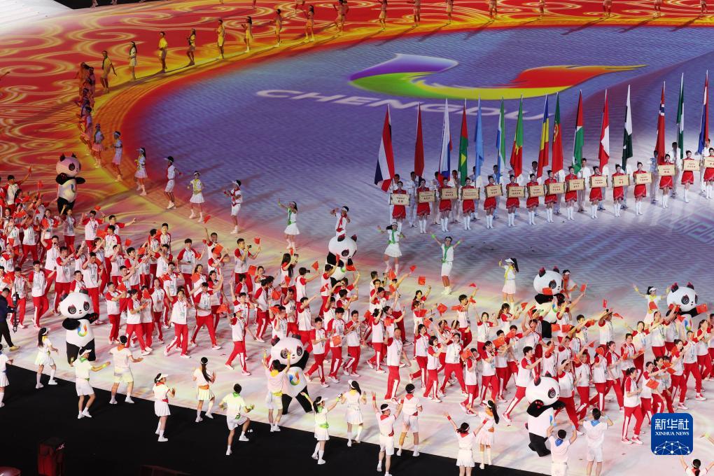 當晚,第31屆世界大學(xué)生夏季運動(dòng)會(huì )開(kāi)幕式在成都東安湖體育公園主體育場(chǎng)舉行。