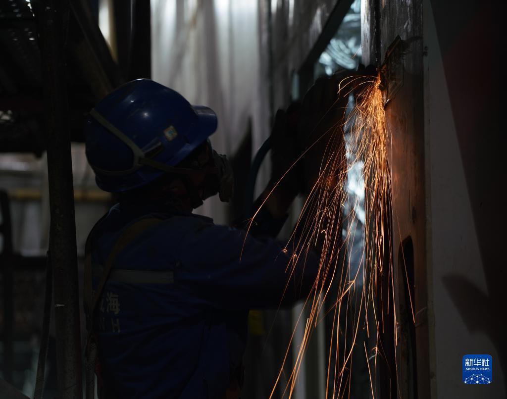 7月28日,招商局金陵船舶(威海)有限公司的工人在船體內部作業(yè)。