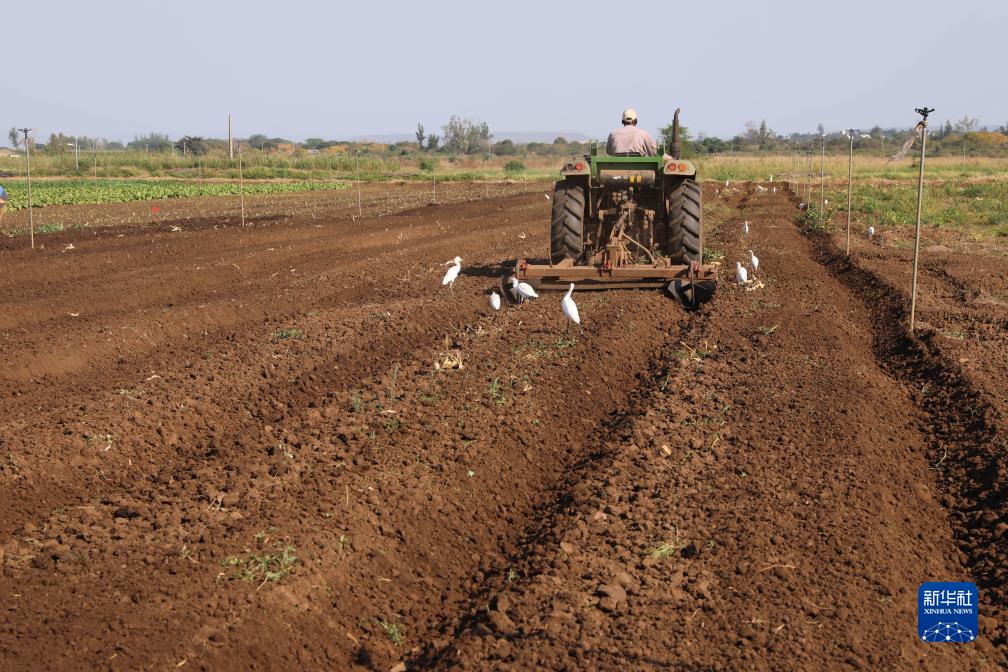 7月28日,在莫桑比克馬普托省博阿內地區,一名工人在中莫農業(yè)技術(shù)示范中心耕地。