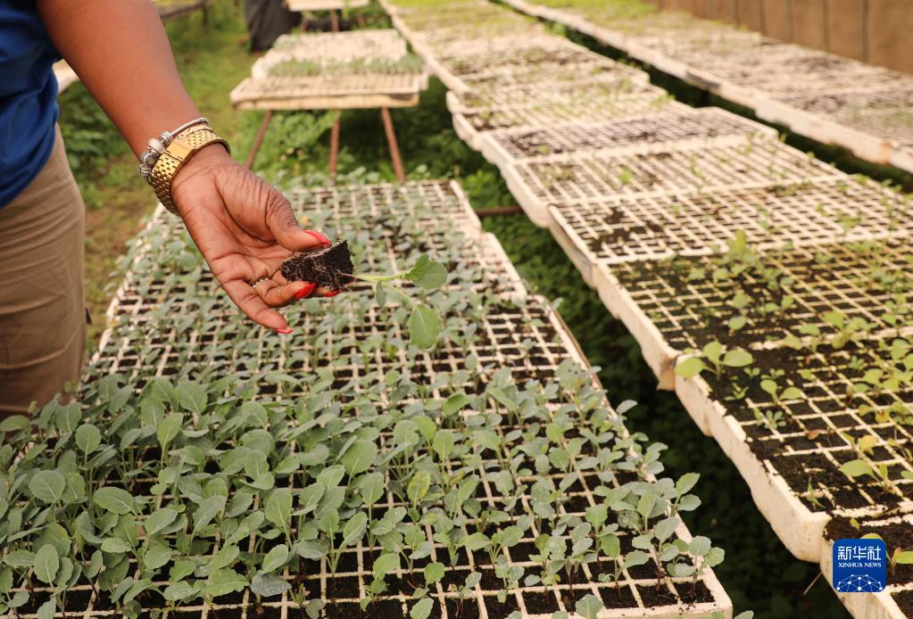 7月25日,在莫桑比克馬普托省博阿內地區,中莫農業(yè)技術(shù)示范中心副主任薩維卡在示范中心蔬菜大棚內展示蔬菜幼苗。