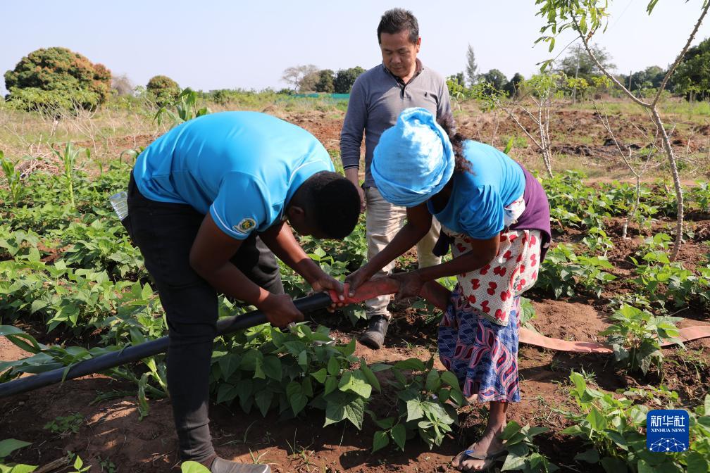 7月28日,在莫桑比克馬普托省博阿內地區,中莫農業(yè)技術(shù)示范中心技術(shù)員(左)幫助當地農民接水管。