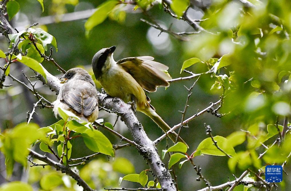 一只伯勞(右)和幼鳥(niǎo)在拉薩市城關(guān)區一處庭院的樹(shù)枝上(7月28日攝)。