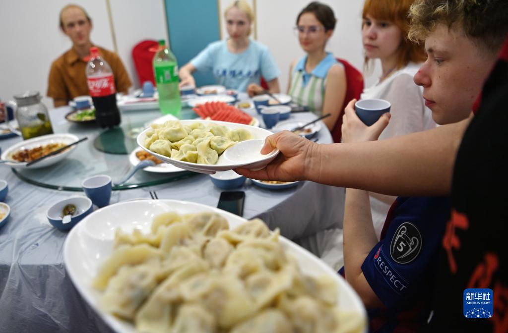 7月29日,參加夏令營(yíng)的來(lái)華學(xué)生在餐廳準備品嘗餃子。
