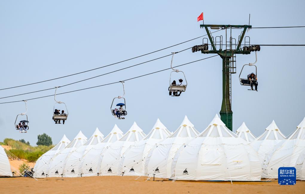 7月29日,游客在鄂爾多斯市達拉特旗境內庫布其沙漠中的銀肯塔拉景區體驗觀(guān)光纜車(chē)。