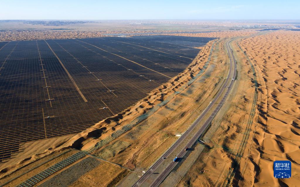 7月21日拍攝的烏瑪高速青銅峽至中衛段穿越騰格里沙漠的18公里高速公路(無(wú)人機照片)。