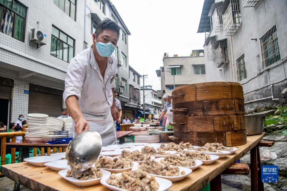 7月29日,在重慶市綦江區安穩鎮,當地居民在“苗家伏羊節”上準備羊肉長(cháng)桌宴。