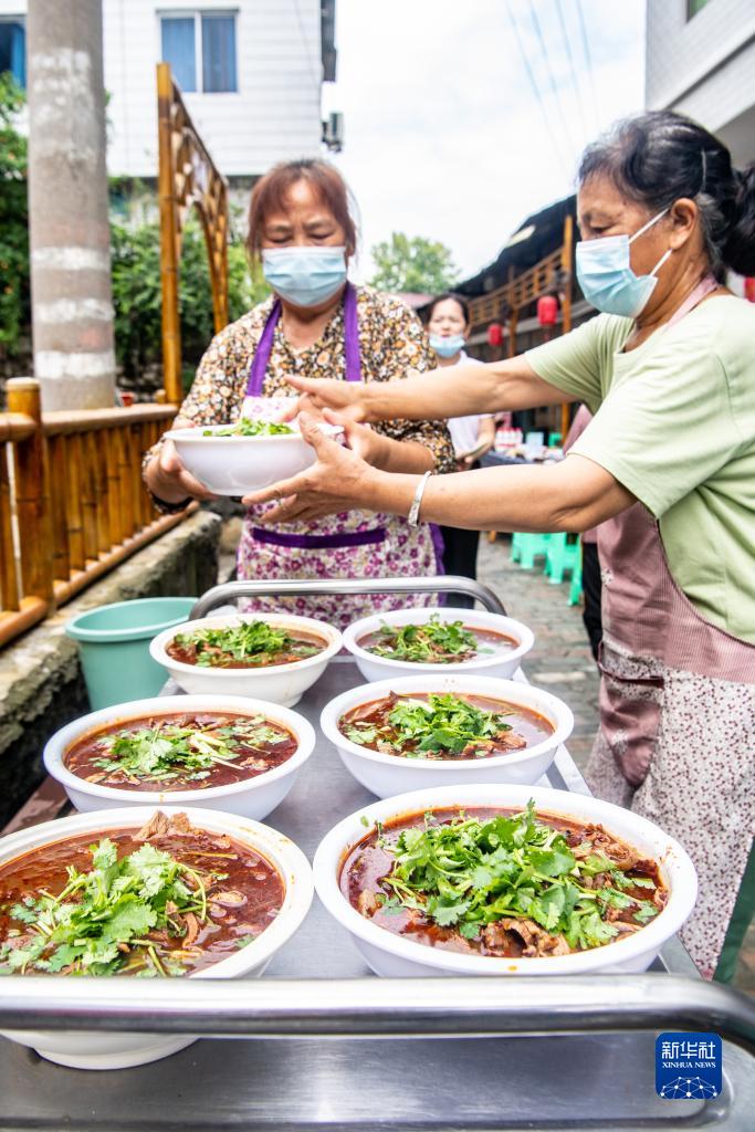 7月29日,在重慶市綦江區安穩鎮,當地居民在“苗家伏羊節”上準備羊肉長(cháng)桌宴。