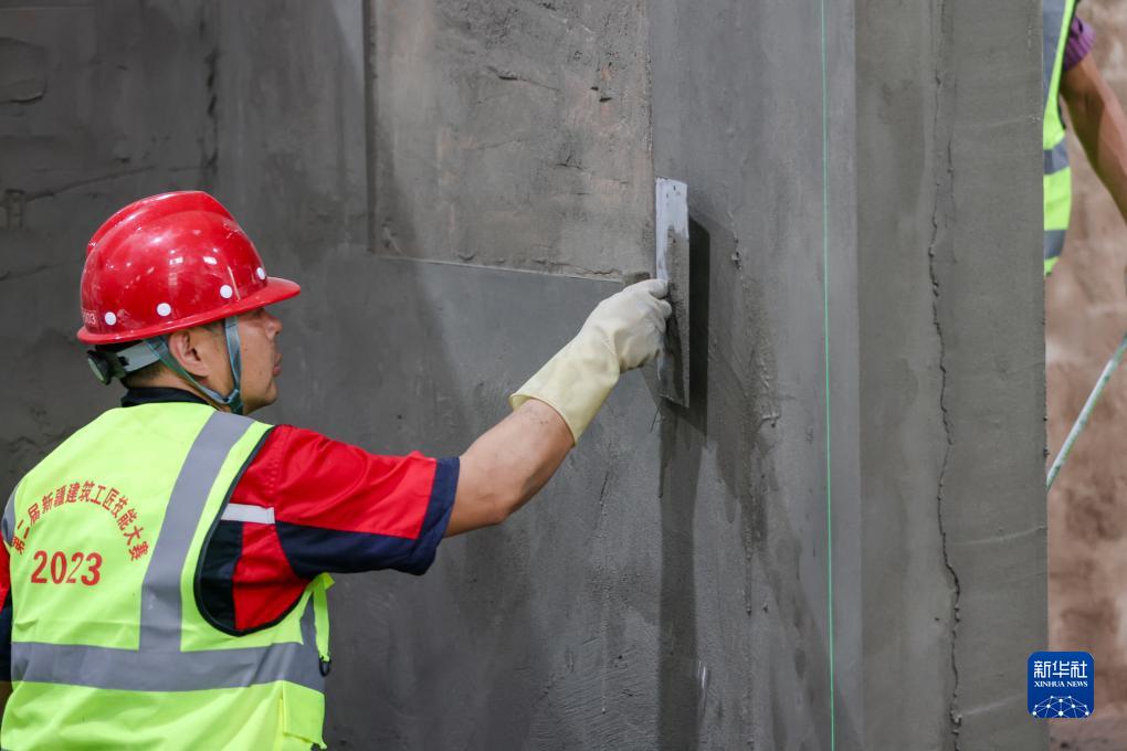 7月29日,在第二屆新疆建筑工匠技能大賽決賽現場(chǎng),參賽選手在進(jìn)行抹灰工項目競賽。