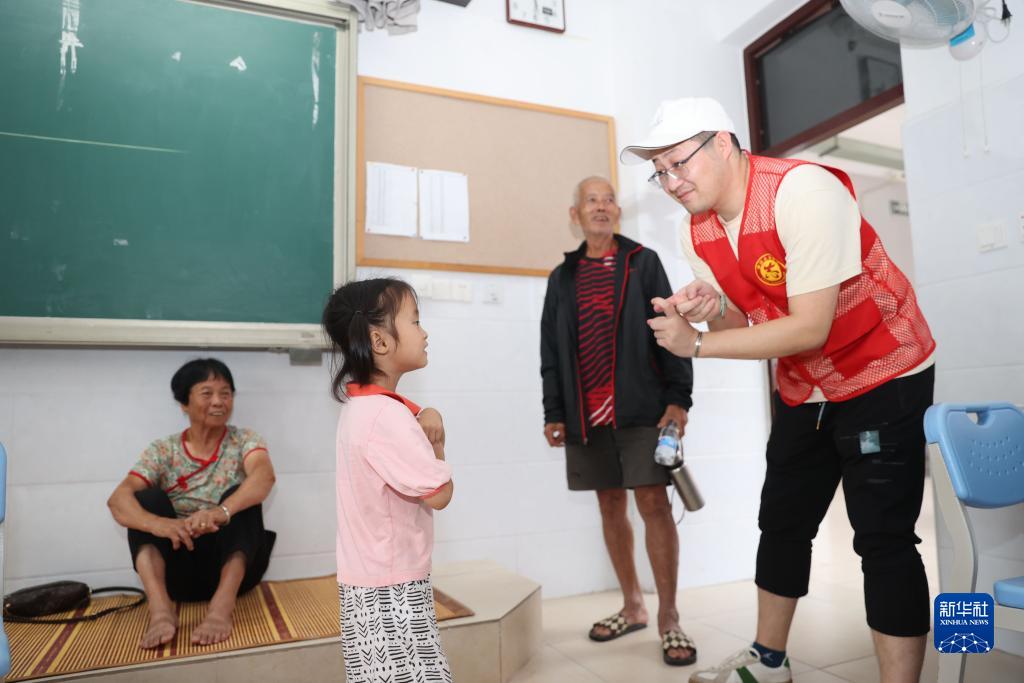 7月29日,在福建省廈門(mén)市新圩學(xué)校臨時(shí)安置點(diǎn),志愿者與被轉移安置的小朋友互動(dòng)。