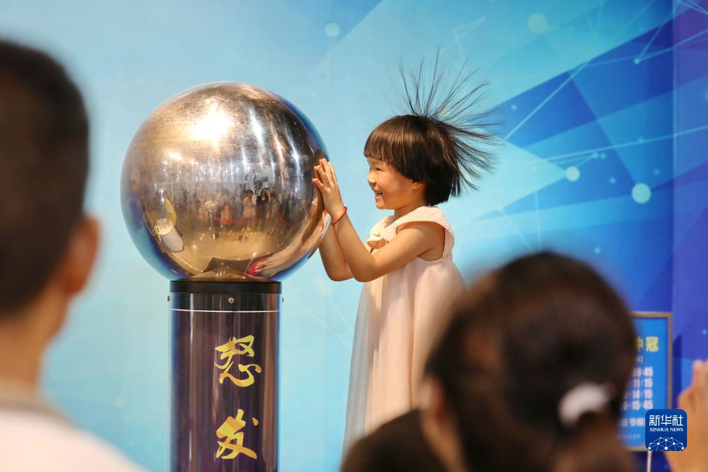 7月29日,在浙江省嘉興市科技館,小朋友體驗“怒發(fā)沖冠”實(shí)驗。