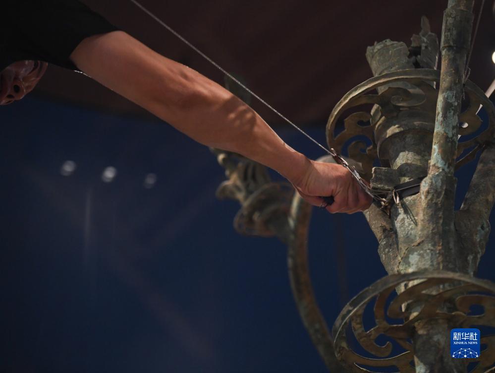 在三星堆博物館老館,工作人員剪斷Ⅰ號大型銅神樹(shù)頂部的固定線(xiàn)(7月16日攝)。