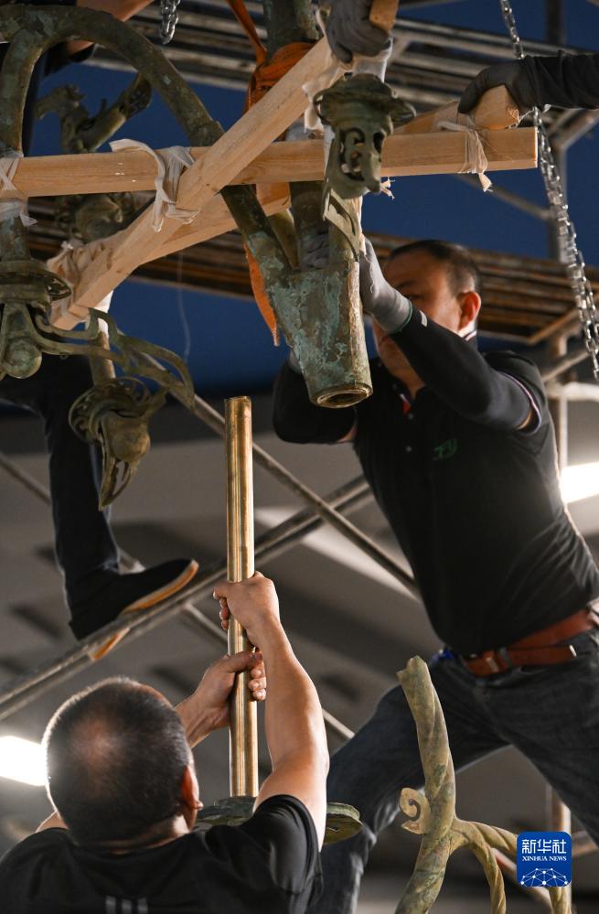在三星堆博物館老館,工作人員成功將Ⅰ號大型銅神樹(shù)上下部分分離(7月16日攝)。
