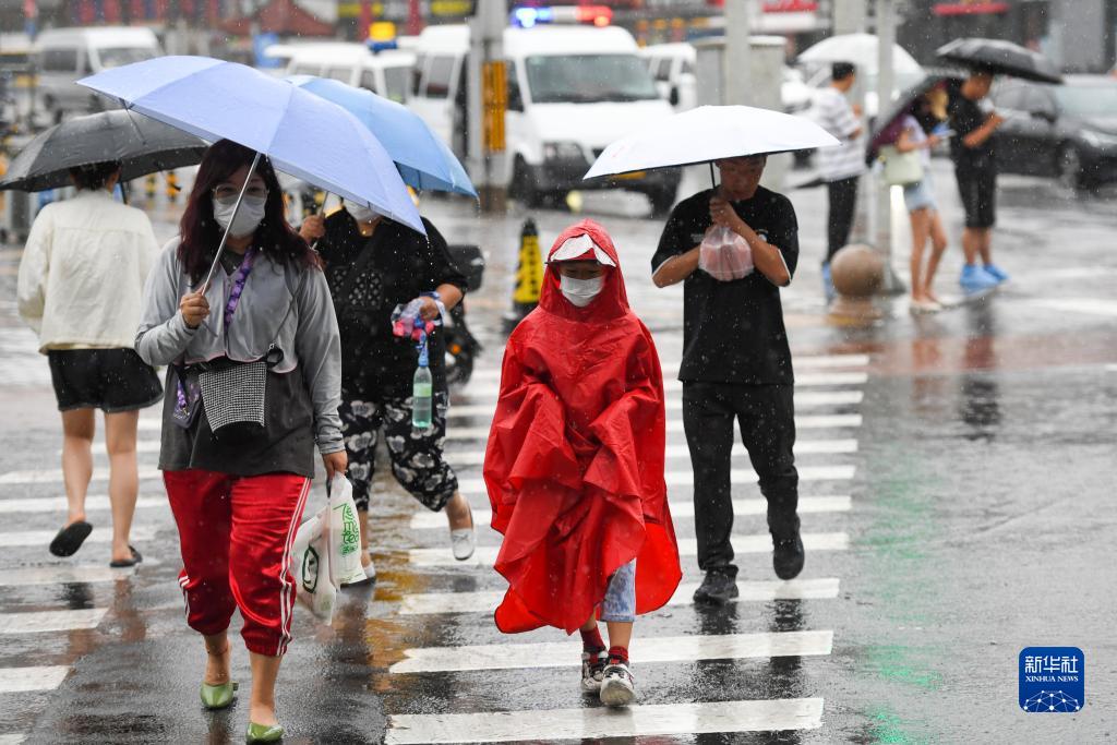 7月30日,在北京市朝陽(yáng)區,行人冒雨行走在路上。