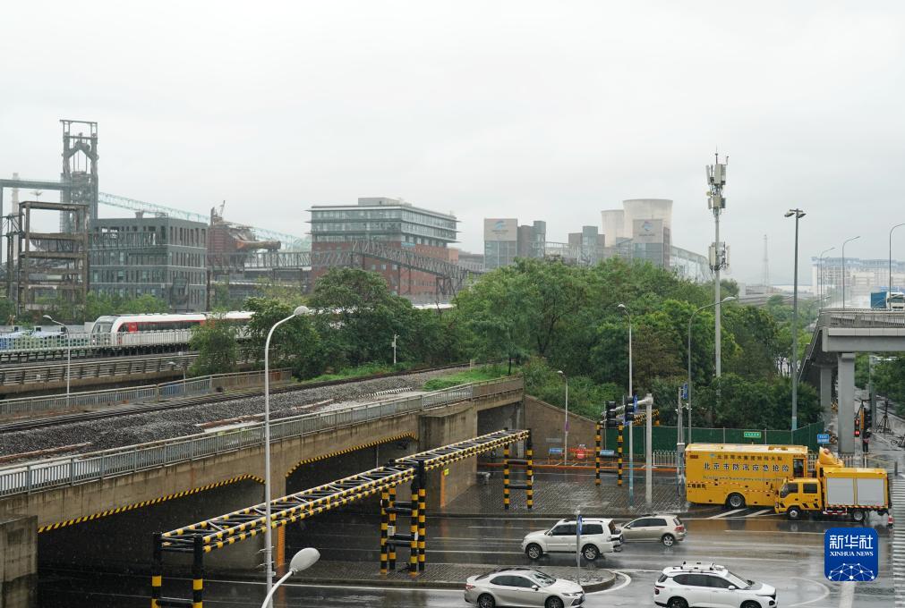 7月30日,在北京市石景山區金安橋附近,工作人員在值守應對可能形成的城市低洼地區積水。