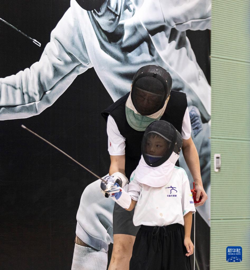 7月30日,在浙江省湖州奧體中心超越擊劍館,教練員在指導小朋友用劍發(fā)力技巧。