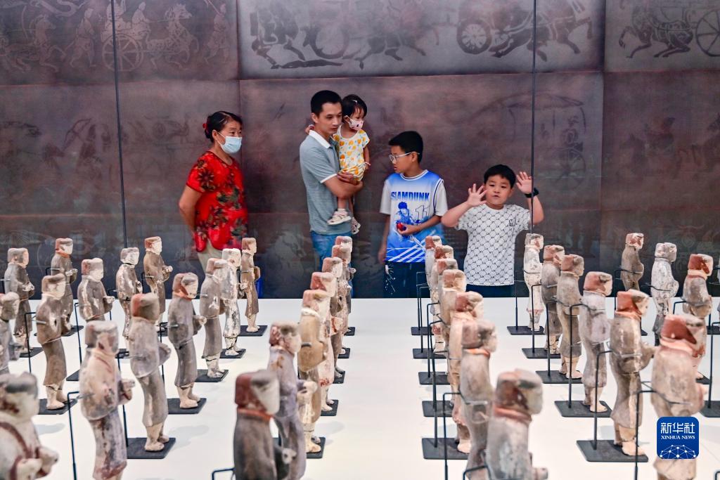 7月30日,家長(cháng)帶領(lǐng)小朋友在山東省青州市博物館參觀(guān)文物展覽。