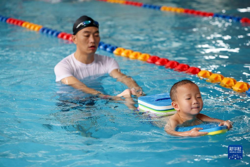 7月30日,在貴州省黔東南苗族侗族自治州丹寨縣一家游泳館,教練指導小學(xué)員學(xué)習正確的游泳姿勢。