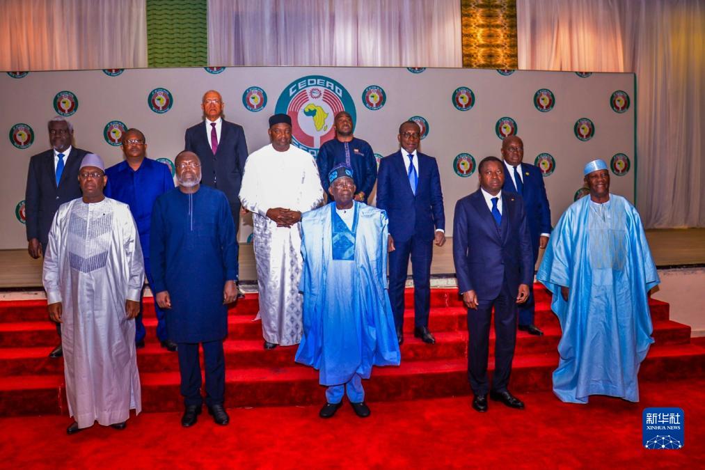 7月30日,在尼日利亞首都阿布賈,參加西非國家經(jīng)濟共同體(西共體)緊急會(huì )議的西非國家領(lǐng)導人合影。