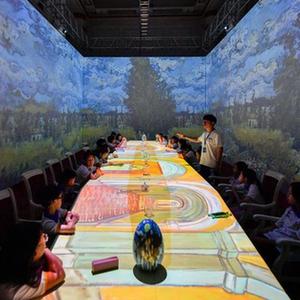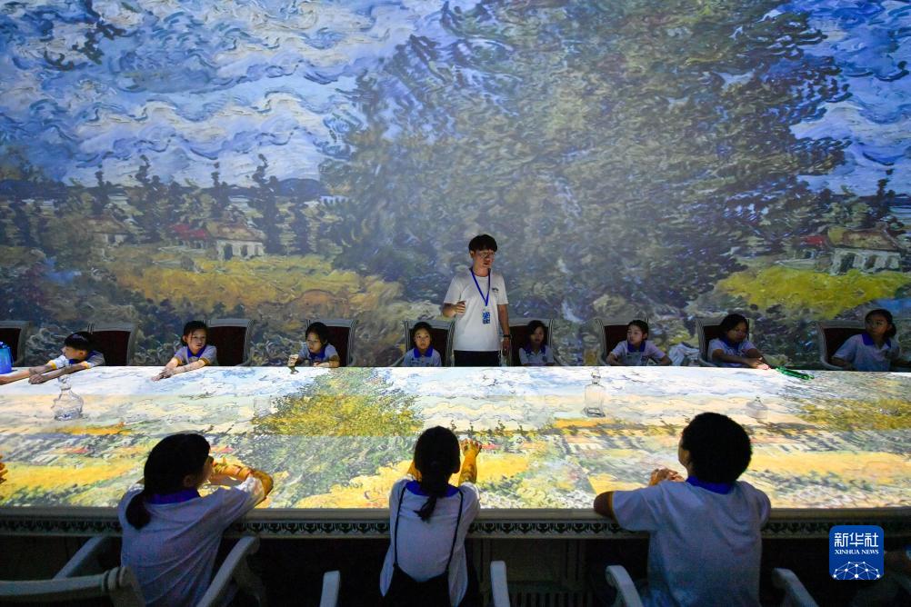 7月30日,在天津數字藝術(shù)博物館,學(xué)生們沉浸式參觀(guān)油畫(huà)藝術(shù)作品。