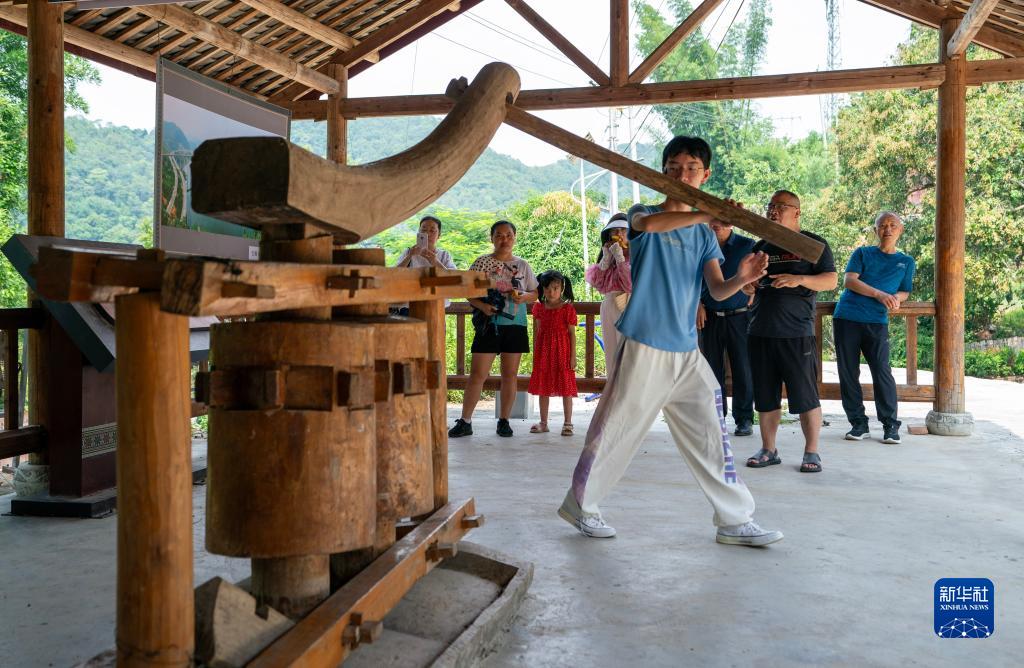 7月30日,一名游客在坡芽村內體驗壯族傳統的甘蔗榨汁機。