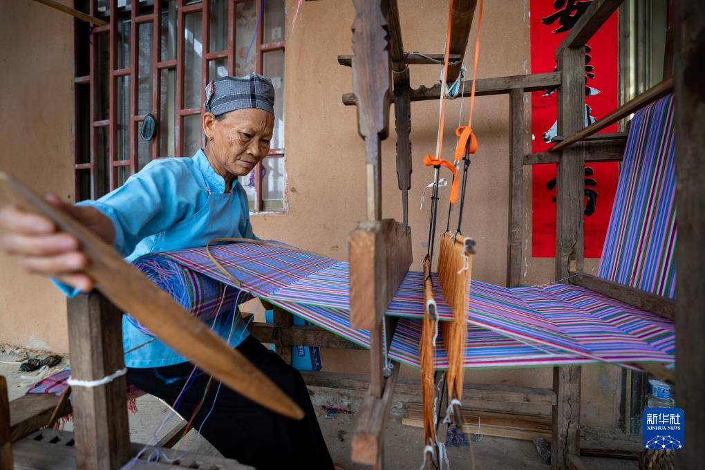 7月30日,一名坡芽村壯族村民在使用織布機織壯錦。