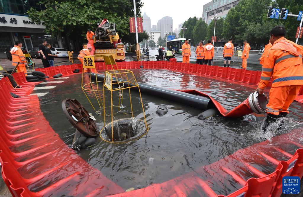 7月31日,在河北省石家莊市裕華路一處積水路段,工作人員進(jìn)行緊急排水。