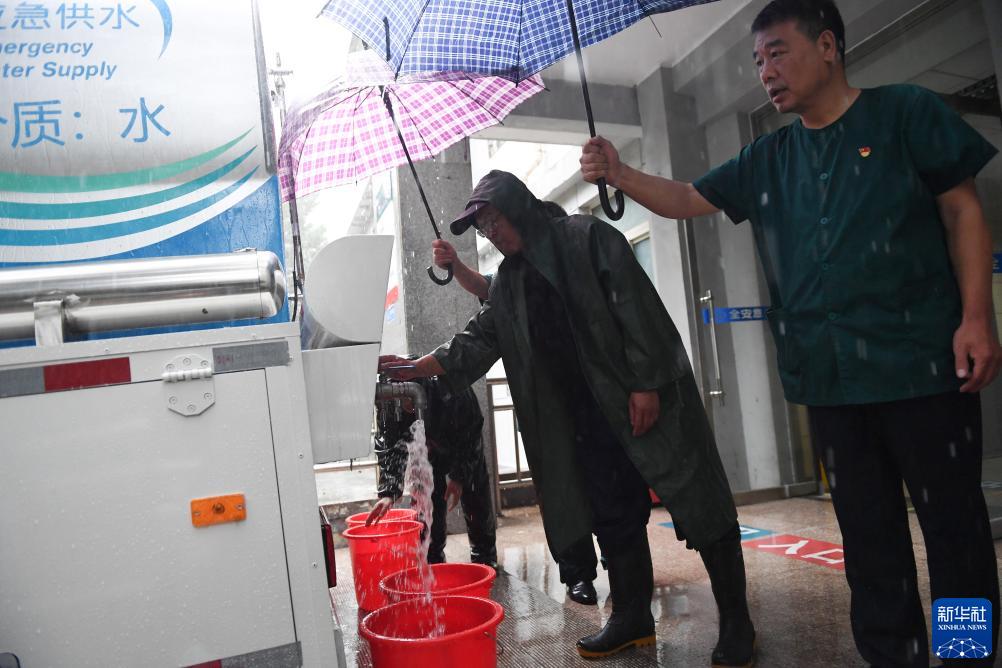 7月31日,在北京市門(mén)頭溝區,一輛北京市自來(lái)水集團的水車(chē)為因強降雨停水的一處療養院供水。