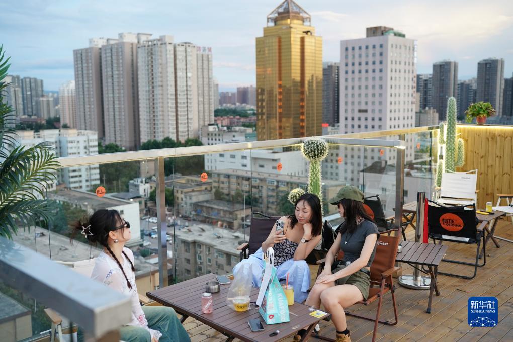 7月26日,年輕人在一棟由停車(chē)樓頂層改造而來(lái)的飲品店內消費休閑。