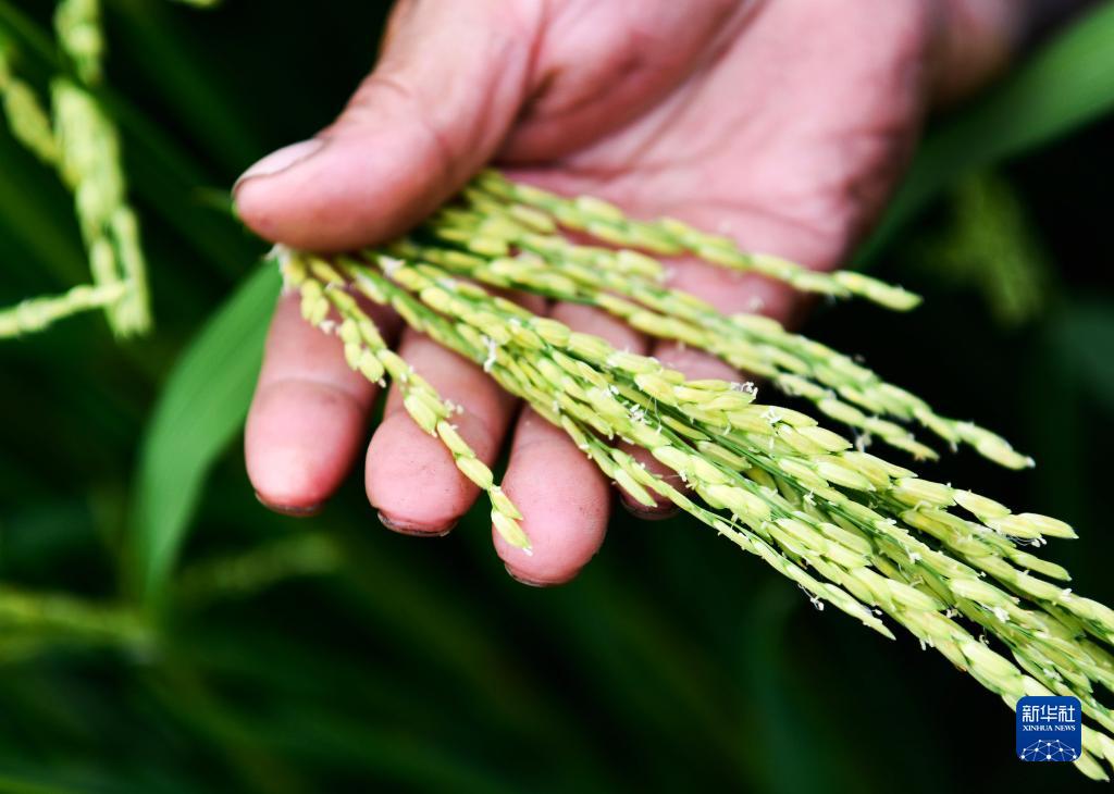 8月1日,農民在貴州省岑鞏縣水尾鎮新場(chǎng)村雜交水稻制種基地查看水稻授粉情況。
