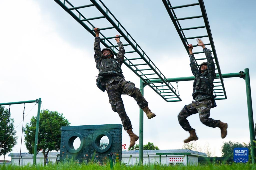 武警安徽總隊蚌埠支隊組織開(kāi)展300米障礙訓練,特戰隊員快速通過(guò)水平懸梯障礙(7月31日攝)。