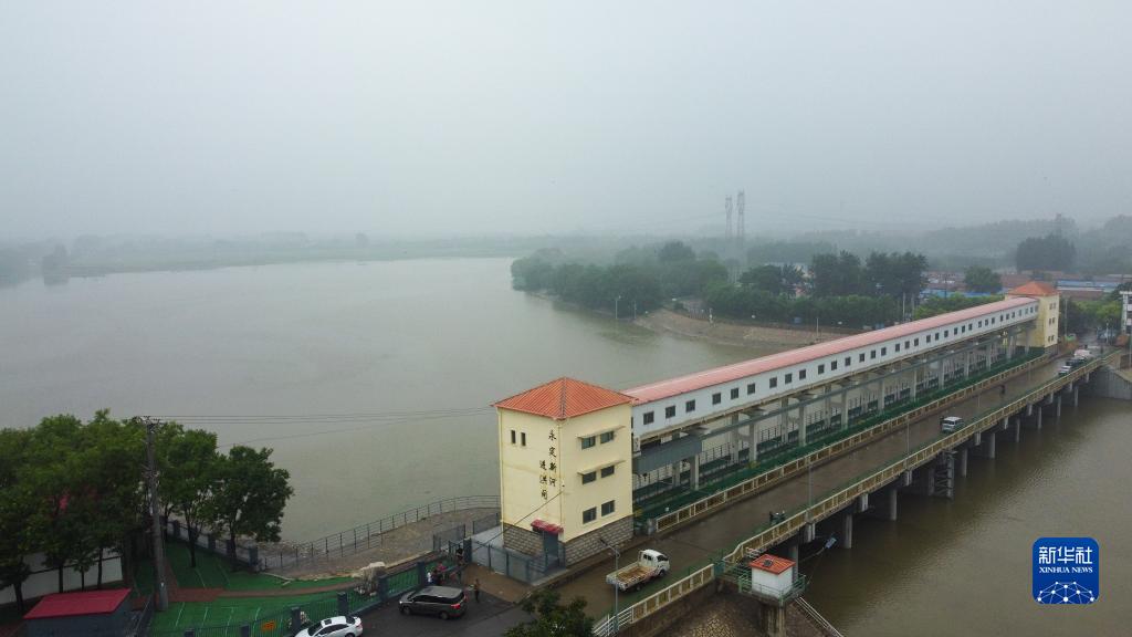 這是8月1日在海河流域永定河下游拍攝的永定新河進(jìn)洪閘現場(chǎng)(無(wú)人機照片)。