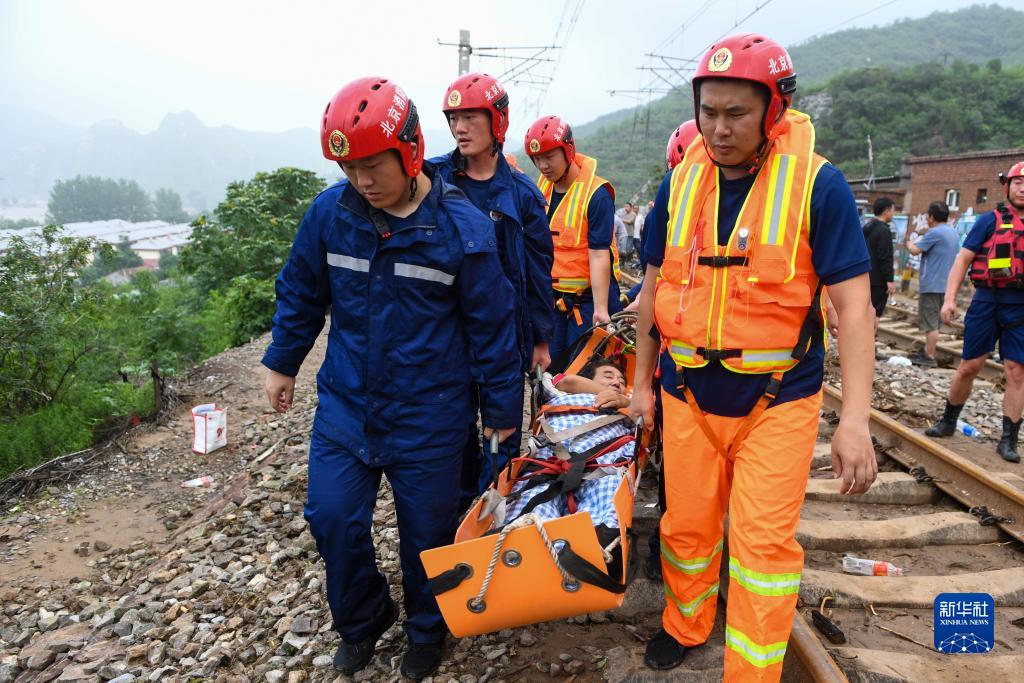 8月1日,在北京市門(mén)頭溝區水峪嘴村,北京門(mén)頭溝區消防救援支隊的消防員在轉運一名受傷村民。