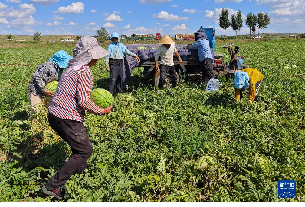 8月12日,內蒙古烏審旗無(wú)定河鎮河南村農民在采摘西瓜。