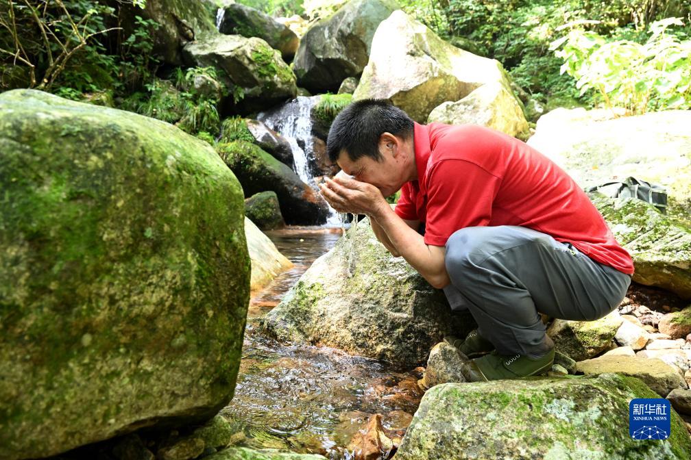 8月12日,在安徽天馬國家級自然保護區天堂寨管理站,王克東在巡山護林途中用山泉水洗臉解乏。