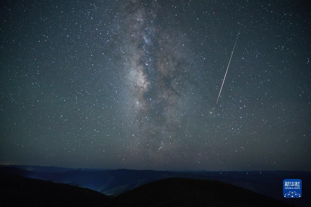 在四川省紅原縣安曲鎮,英仙座流星雨劃過(guò)夜空(8月12日攝)。