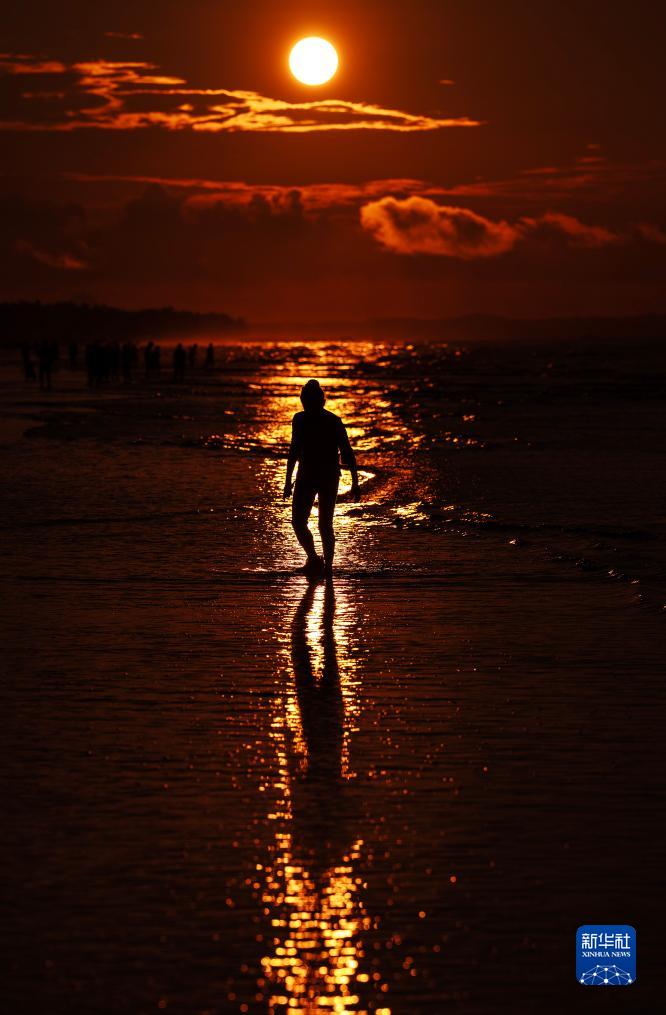 8月14日,游客在金灘上欣賞日出時(shí)的朝霞。