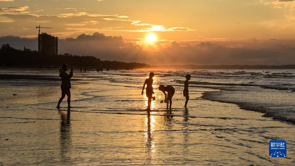 8月14日,游客在金灘上欣賞日出時(shí)的朝霞。