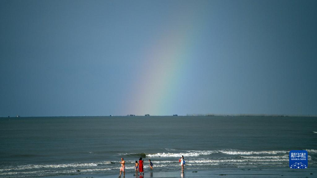 當日,一場(chǎng)晨雨過(guò)后,日出時(shí)分,在廣西東興的金灘,“國道之行 從雪山奔向大?!眻蟮澜M偶遇了朝陽(yáng)與彩虹“共舞”的奇妙景觀(guān)。