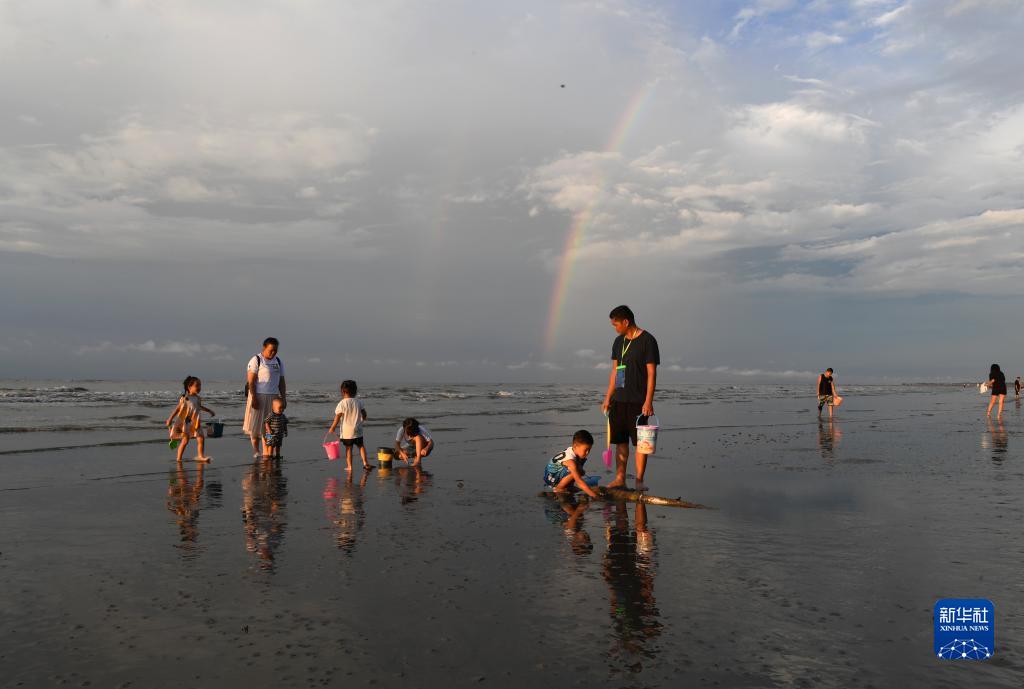 當日,一場(chǎng)晨雨過(guò)后,日出時(shí)分,在廣西東興的金灘,“國道之行 從雪山奔向大?!眻蟮澜M偶遇了朝陽(yáng)與彩虹“共舞”的奇妙景觀(guān)。