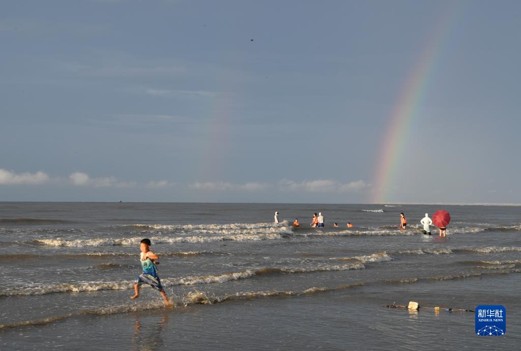 當日,一場(chǎng)晨雨過(guò)后,日出時(shí)分,在廣西東興的金灘,“國道之行 從雪山奔向大?!眻蟮澜M偶遇了朝陽(yáng)與彩虹“共舞”的奇妙景觀(guān)。