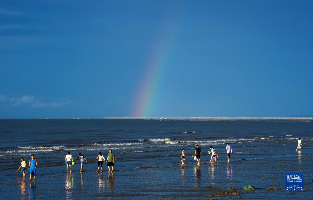 當日,一場(chǎng)晨雨過(guò)后,日出時(shí)分,在廣西東興的金灘,“國道之行 從雪山奔向大?!眻蟮澜M偶遇了朝陽(yáng)與彩虹“共舞”的奇妙景觀(guān)。