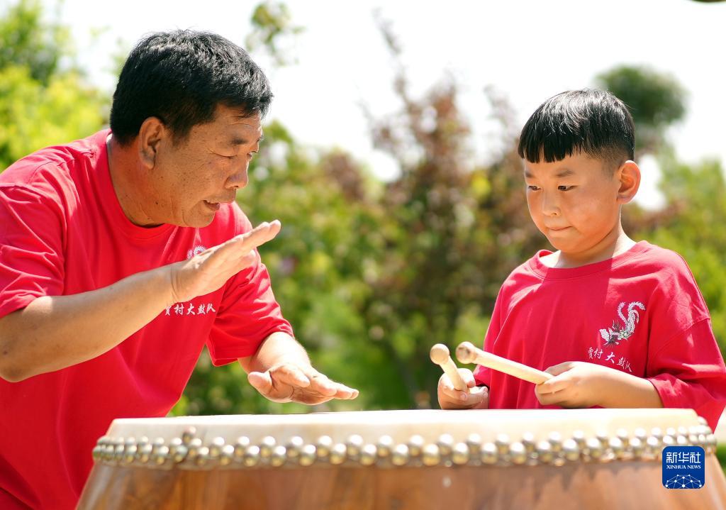 8月14日,在河北省滄州市滄縣舊州鎮賈村,大鼓藝人指導學(xué)生練習賈村大鼓。
